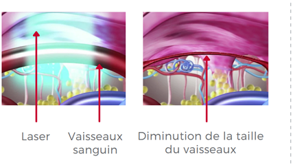 L'énergie laser agit directement sur les vaisseaux sanguins en les chauffant, pour entrainer leur coagulation. Les vaisseaux sanguins disparaîtront progressivement après la séance, le temps que l'organisme élimine la lésion coagulée.